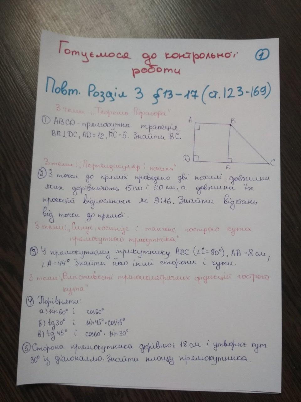 1. ABCD- прямокутна трапеція, ВК _|_ DC, AD=12, KC=5. Знайти ВС
