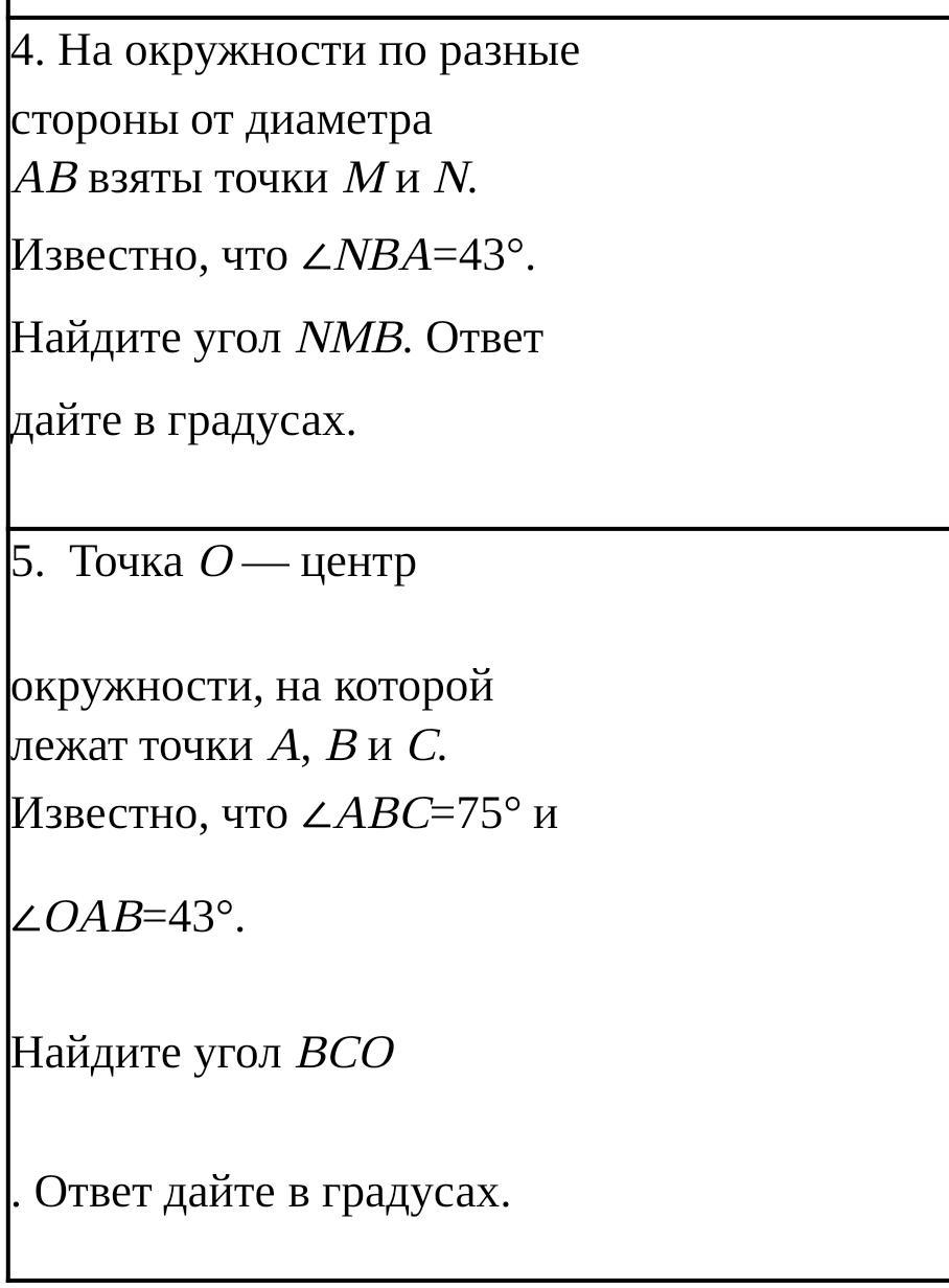 Угол NBA — вписанный, поэтому он равен половине дуги, на которую он опирается. Следовательно, дуга AN = 2∠NBA = 2*43 = 86. Диаметр AB делит окружность на две равные части, поэтому величина дуги ANB равна 180°. Откуда дуга NB = 180-86= 94. Угол NMB — вписанный, поэтому он равен половине дуги, на которую он опирается, то есть равен 94/2 =47.