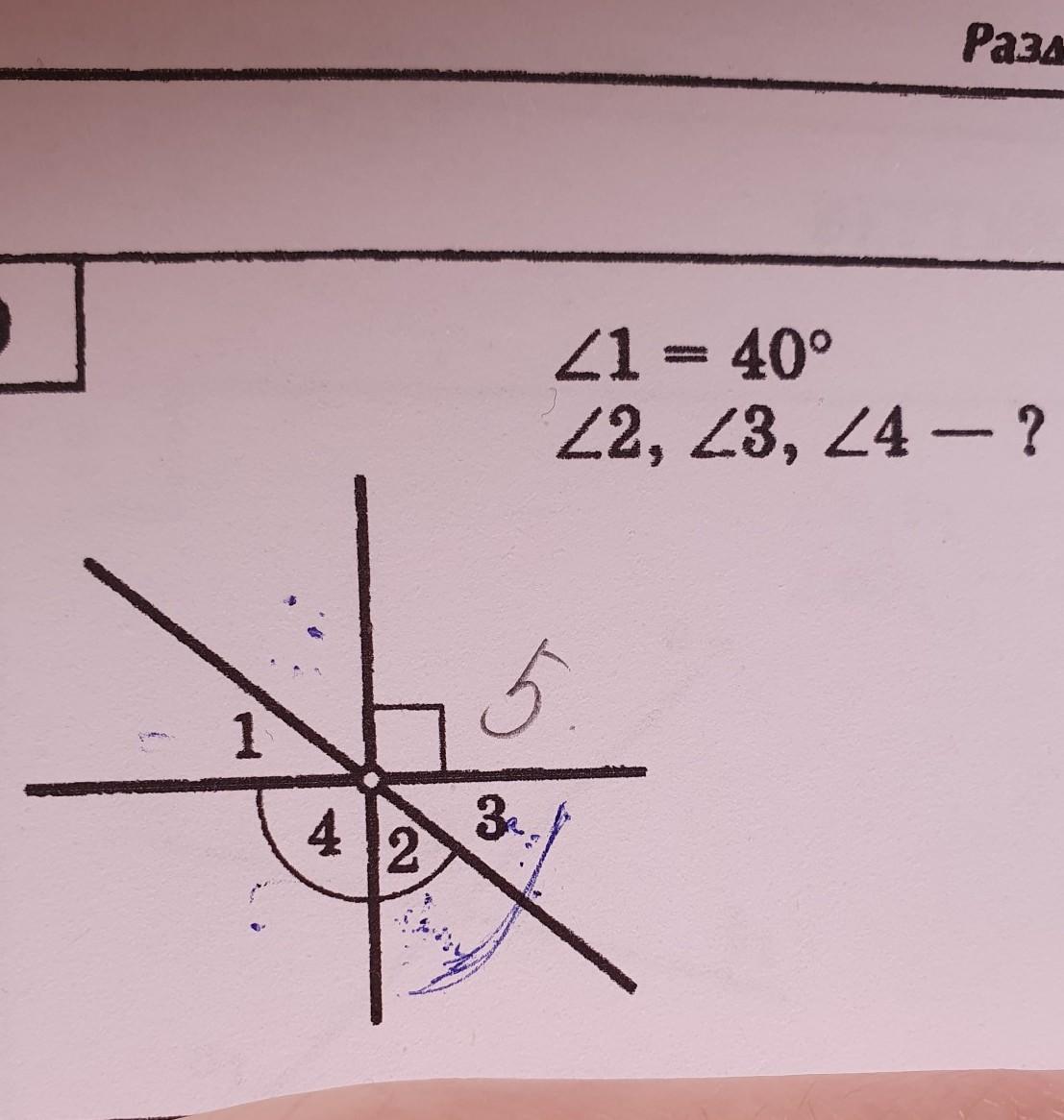 У нас есть прямая 180 градусов. Угол 5 равен 90 градусам, а первый угол-40 градусам. 180-90-40=50 градусов. Значит тот угол, который получился между 1 и 5 будет одинаков со 2 углом. 4 угол будет равен 90 градусам. А 3 угол узнаем и того, что там прямой угол, то есть 90-2 угол. 90-50=40. 3 угол равен 40 градусам.