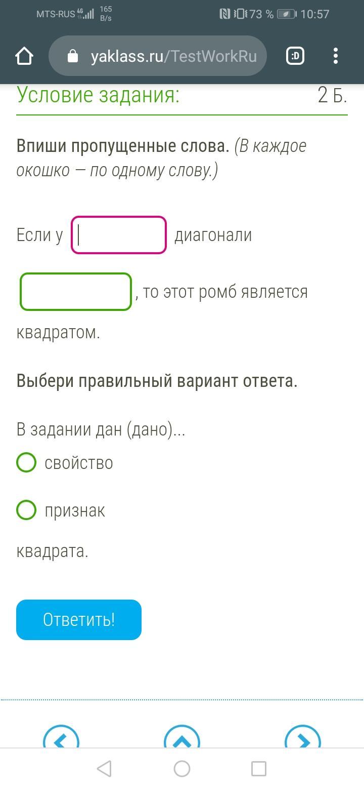 Ответ:У квадрата диагонали точкой пересечения делятся пополам.
