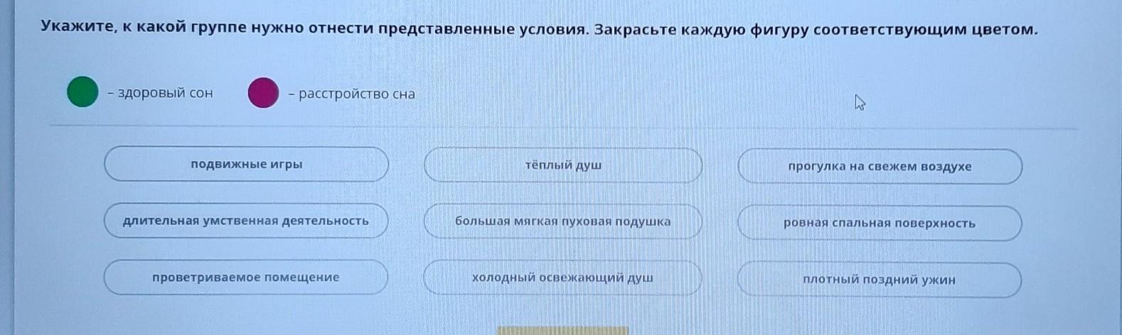 укажите к какой группе нужно отнести представленные условия. закрасьте каждую фигуру соответстующим цветом