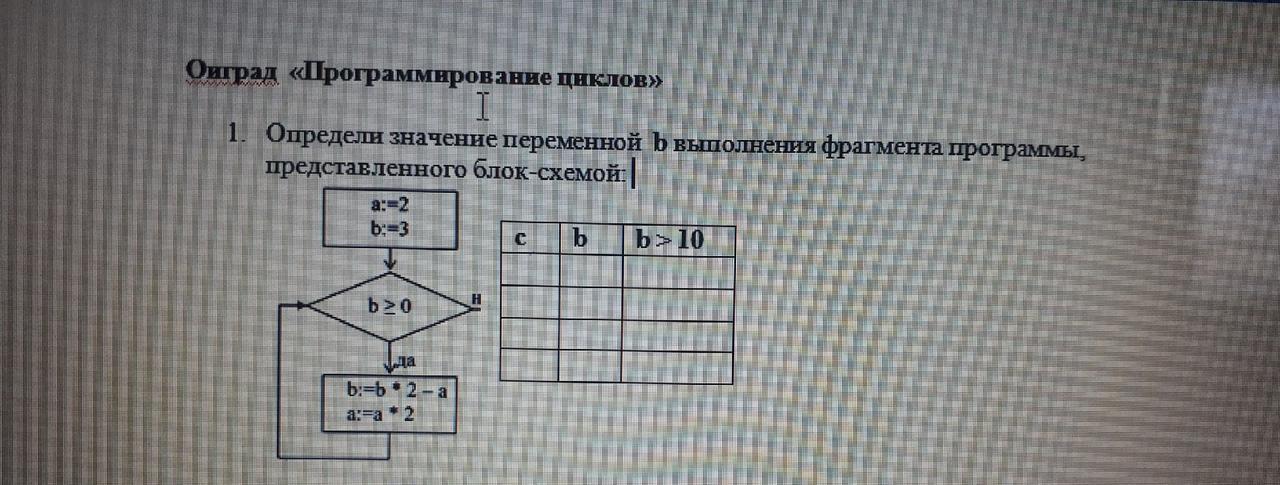 1. Определи значение переменной b выполнения фрагмента программы, представленного блок-схемой:
