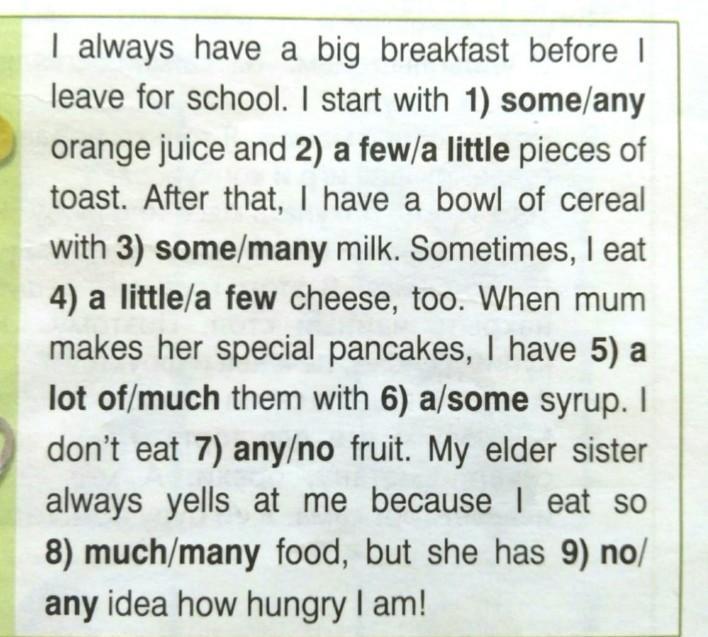 Перевод: Перед уходом в школу у меня всегда большой завтрак. Я начинаю с небольшого количества апельсинового сока и нескольких тостов. После этого у меня есть миска хлопьев с молоком. Иногда я ем и немного сыра также. Когда мама делает ей специальные блины, у меня их много с разным сиропом. Я не ем никаких фруктов. Моя старшая сестра всегда кричит на меня, потому что я ем так много еды, но она понятие не имеет, насколько я голоден!