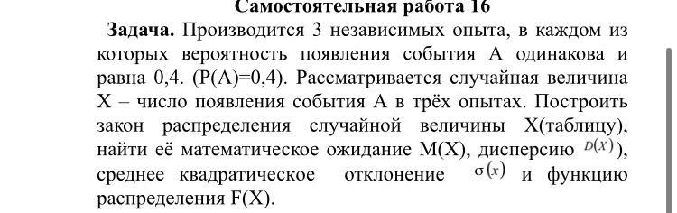 Ответ:Случайная величина X может принимать значения ; ; ; . Соответствующие им вероятности найдем, воспользовавшись формулой Бернулли. При n=3, ; имеем: ; ;