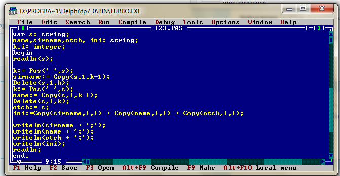 Тема - обработка символьных величин на Паскале. Ввести свою фамилию, имя и отчество как одно текстовое данное, используя пробел как разделитель. Вывести на экран - фамилию; - имя; - фамилию и инициалы.