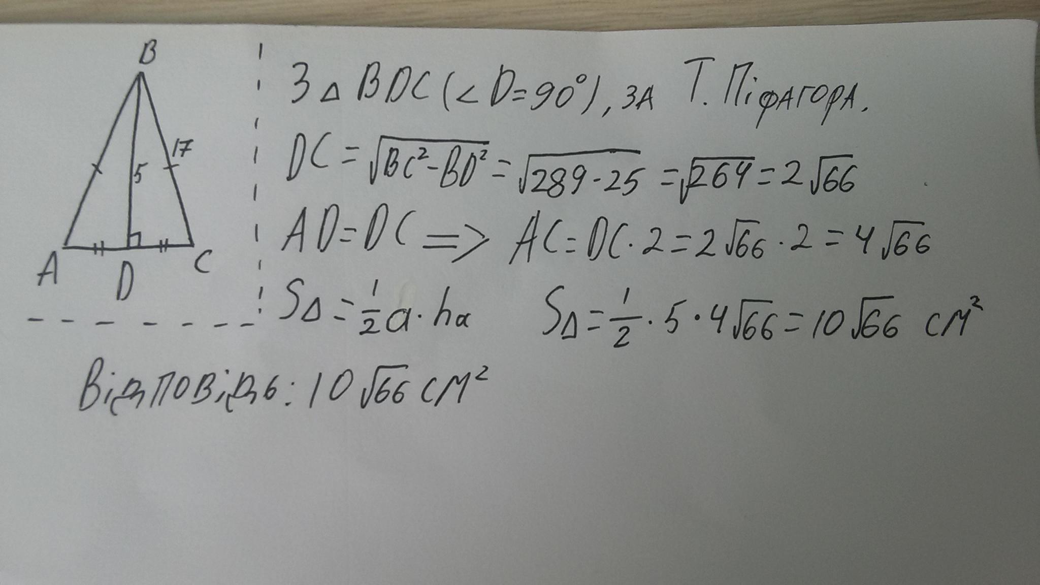 знайдіть площу рівнобедреного трикутника бічна сторона якого 17см а висота проведена до основи 5 см
