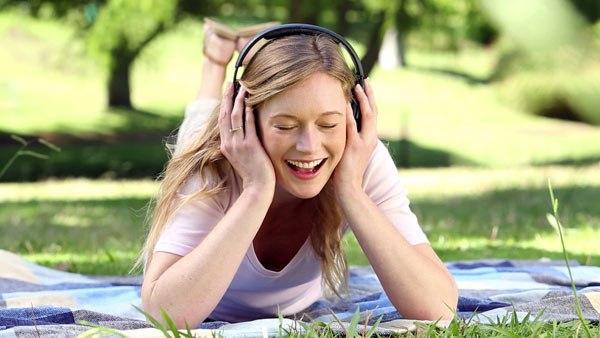 I see the girl in the photo. She's in a good mood. The weather is Sunny. She's wearing a t-shirt and jeans. She's wearing headphones,she likes the music that's playing. she's in the Park. she is married, she has a ring.