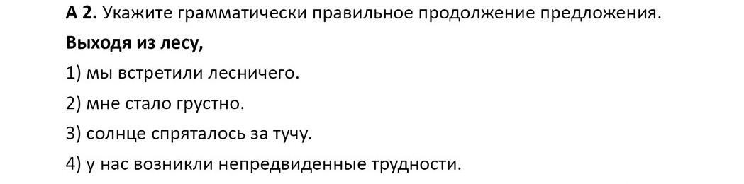 выполнять действие "выходя" (выходить) и второе действие должен один и тот же предмет, например если мы отметим третий вариант, получится что солнце не только спряталось, но и выходило из лесу, а так в первом варианте мы и выходили из лесу, и встретили лесничего