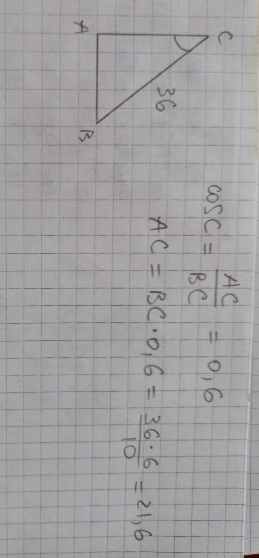 Известно, что в прямоугольном треугольнике ABC с прямым углом A гипотенуза BC=36, cosC=0,6. Определи длину катета AC.