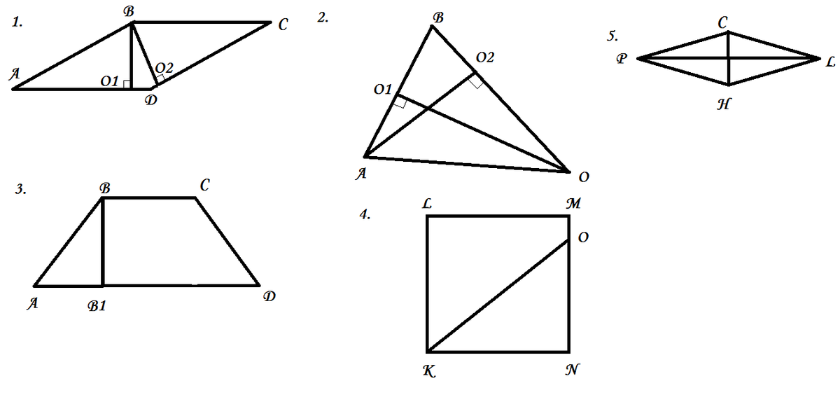1) ABCD - параллелограмм. BO1 = 6 дм, BO2 = 8 дм, <А = 30 градусов. Найдите площадь ABCD.