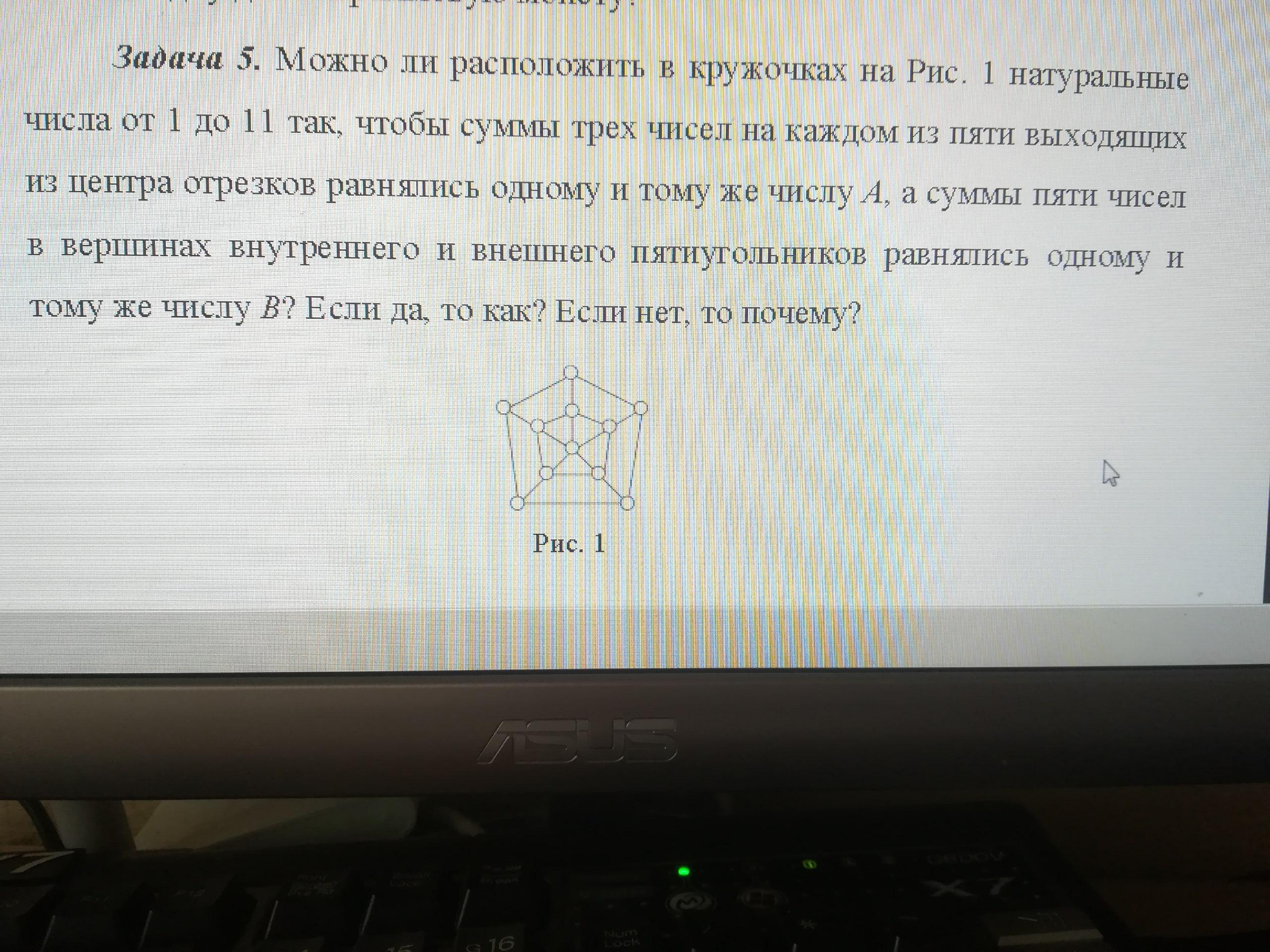 Можно ли расположить в кружочках на Рис. 1 натуральные числа от 1 до 11 так, чтобы суммы трех чисел на каждом из пяти выходящих из центра отрезков равнялись одному и тому же числу А, а суммы пяти чисел в вершинах внутреннего и внешнего пятиугольников равнялись одному и тому же числу В? Если да, то как? Если нет, то почему? ПОМОГИТЕ СРОЧНО ПОЖАЛУЙСТА