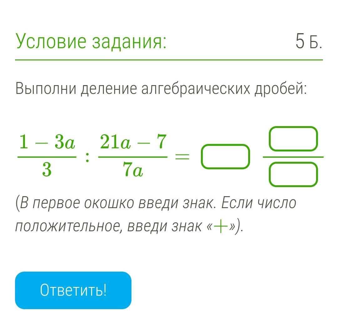 Ответ: 1-3а/3:21а+7=1-3а/3*7/21а=1-3а/3*7а/7(3а+1)=1-3а/3*а/3а+1=а(1-3а)/3(3а-1)=а-3а'2/9а+3
