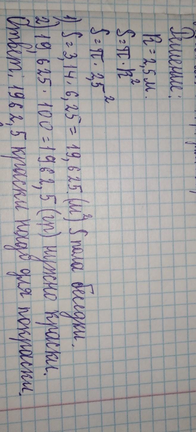Радиус круглой беседки 2.5 м, необходимо покрасить пол беседки. Сколько краски надо для покраски, если на 1м.кв потребуется 100 гр краски?