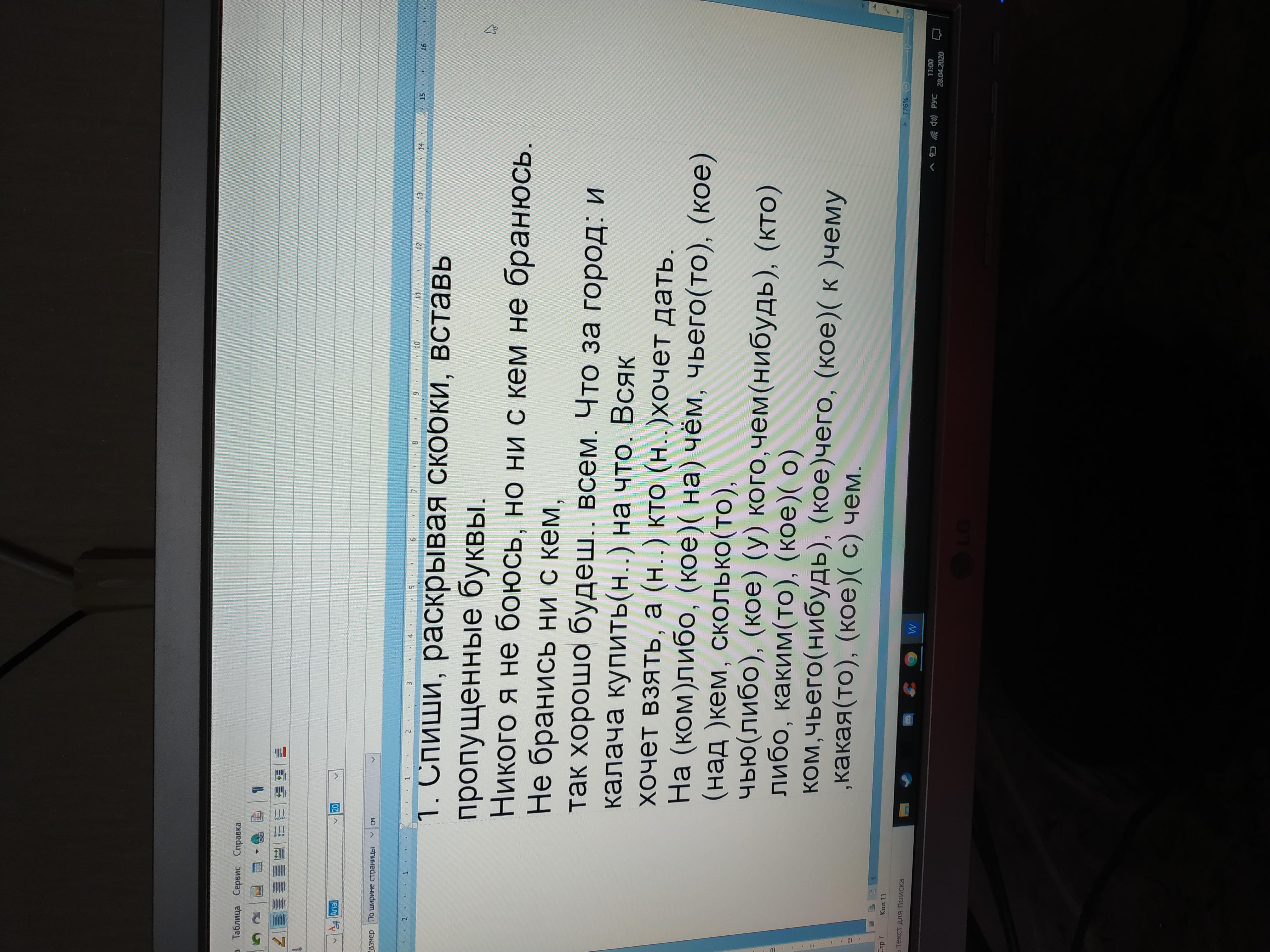 Никого я не боюсь, но ни с кем не бранюсь. Не бранись ни с кем, так хорошо будешь всем. Что за город: и калача купить не на что. Всяк хочет взять, а никто не хочет дать. На ком либо, кое на чём, чьего то, кое над кем, сколько то, чью либо, кое у кого, чем нибудь, кто либо, каким-то, кое о ком, чьего нибудь, кое чего, кое к чему, какая-то, кое с чем.