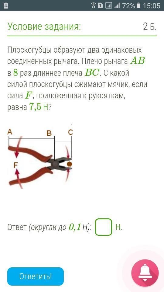 Плоскогубцы образуют два одинаковых соединённых рычага. Плечо рычага AB в 8 раз длиннее плеча BC. С какой силой плоскогубцы сжимают мячик, если сила F, приложенная к рукояткам, равна 7,5 Н?