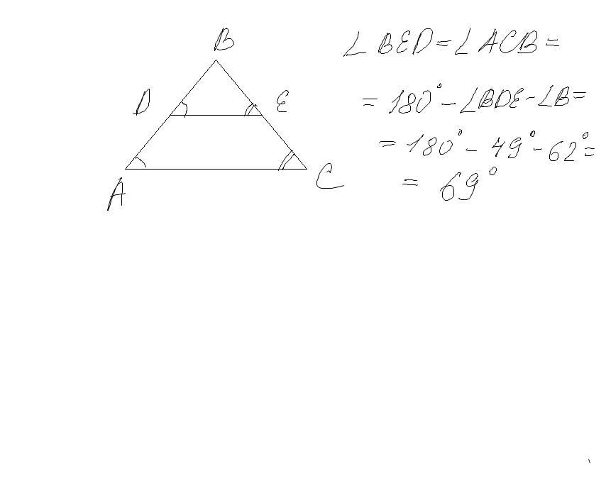 D∈AB,E∈BC, ∢CBA=62°, ∢BDE=49°.
