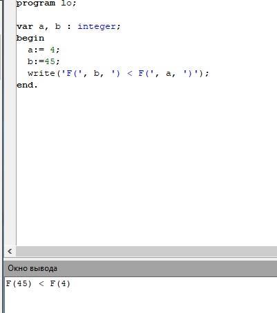 Что будет выведено на экран после выполнения команды «вывод»? a:=4 b:=45 вывод “F(“, b, “) < F(“, a, “)" *