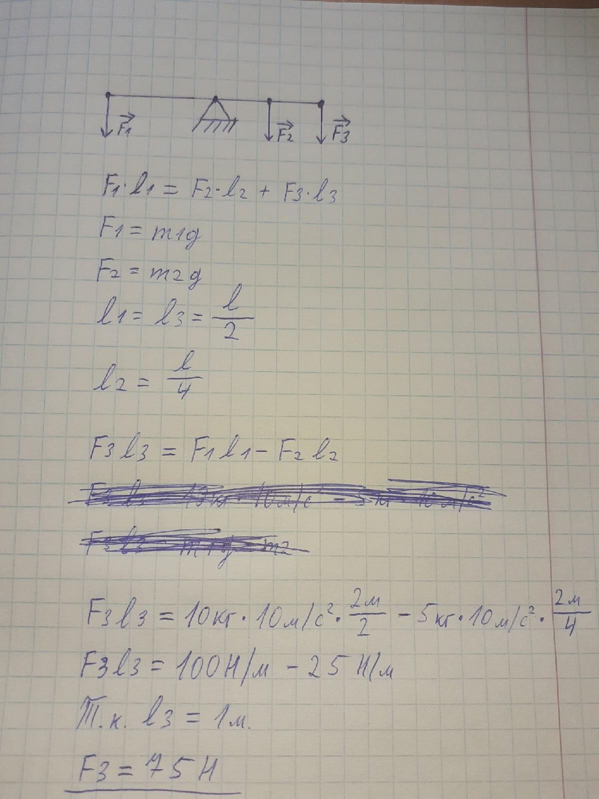 Мальчики во дворе решили устроить эксперимент. Они нашли большую доску, длиной 2 м и сделали из нее рычаг. На один край они положили арбуз, массой 10 кг, а на середину второго края положили дыню, массой 5 кг. С какой силой нужно нажать на конец второго края (где лежит дыня), чтобы доска была в равновесии?