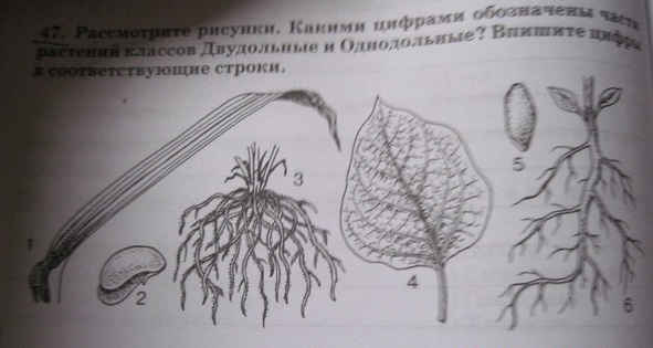 Рассмотрите рисунки. Какими цифрами обозначены части растений классов Двудольные и Однодольные? Впишите цифры в соответствующие строки.