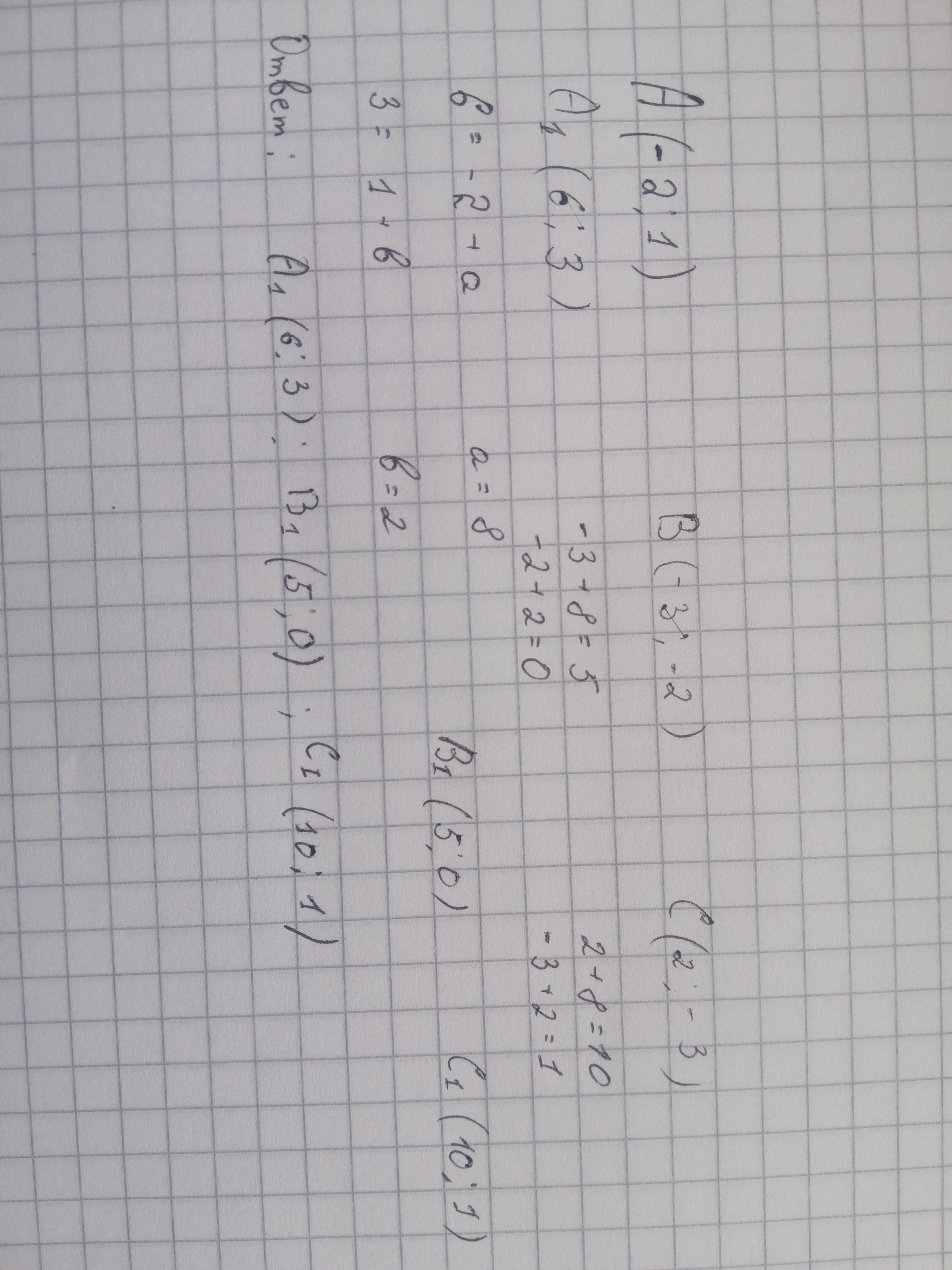 Знайдіть координати вершин трикутника який є образом трикут- ника АВС, А(-2;1), В(-3;-2), С(2;-3), при симетрії відносно точки, якщо образом точки А є А1(6;3).