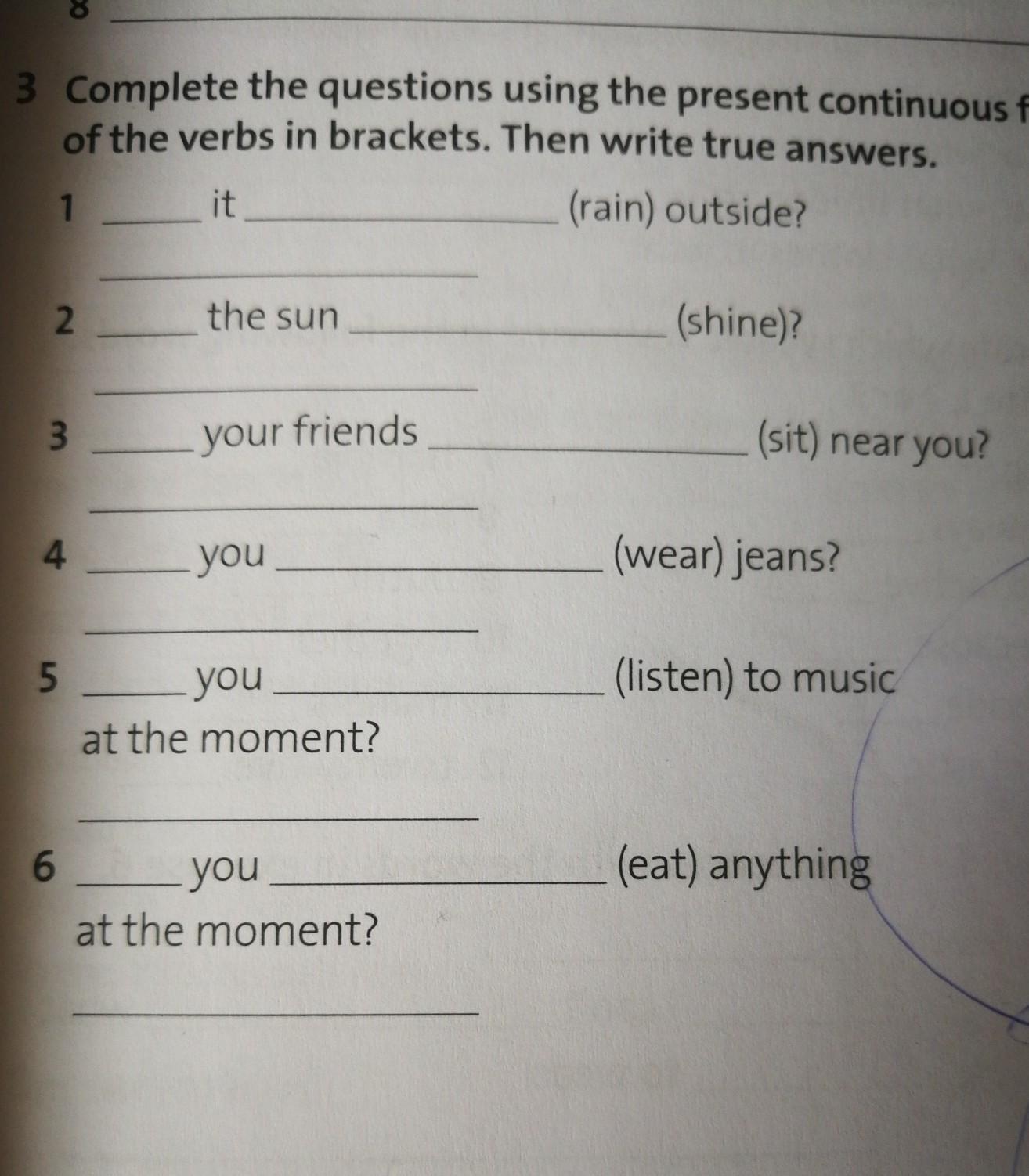 compile the quations using the present continuous form of the verbs in bracket. then write true answer