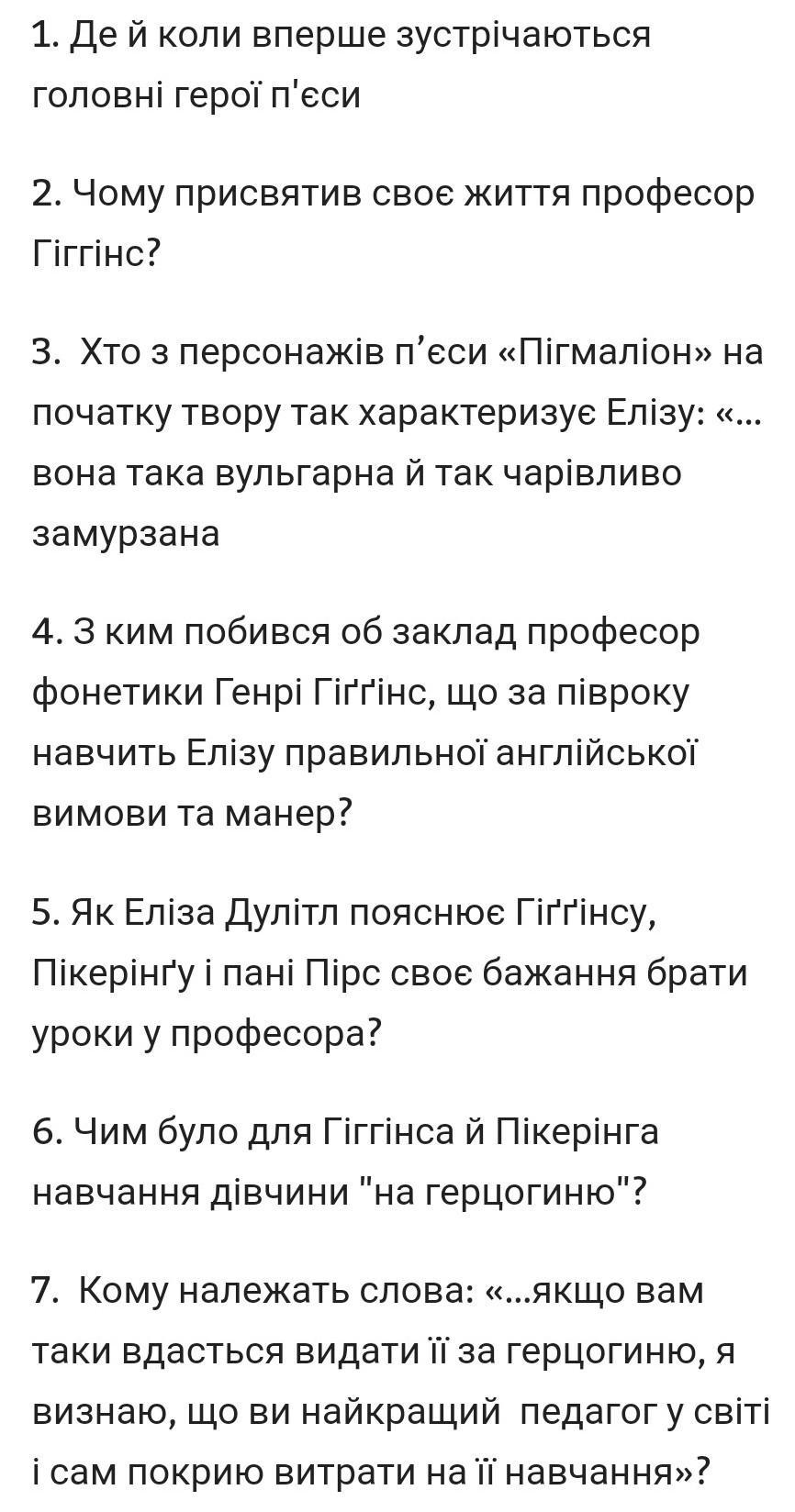 Дайте відповідь на питання вікторини до тексту п’єси Б.Шоу Пігмаліон ​
