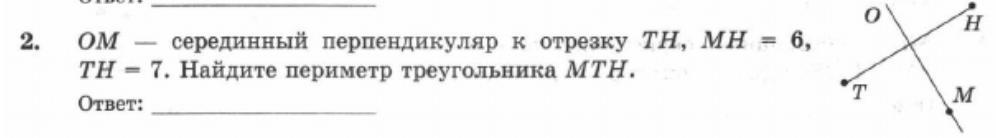 Ом- серединный перпендикуляр к отрезку TH , MH=6, TH=7. Найдите периметр треугольника MTH