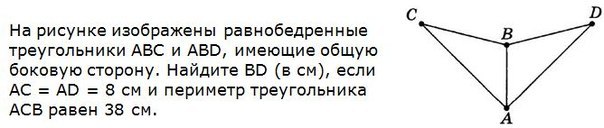На рисунке изображены равнобедренные треугольники ABC и ABD, имеющие общую боковую сторону. Найдите BD (в см), если AC = AD = 8см и периметр треугольника ACB равен 38см.