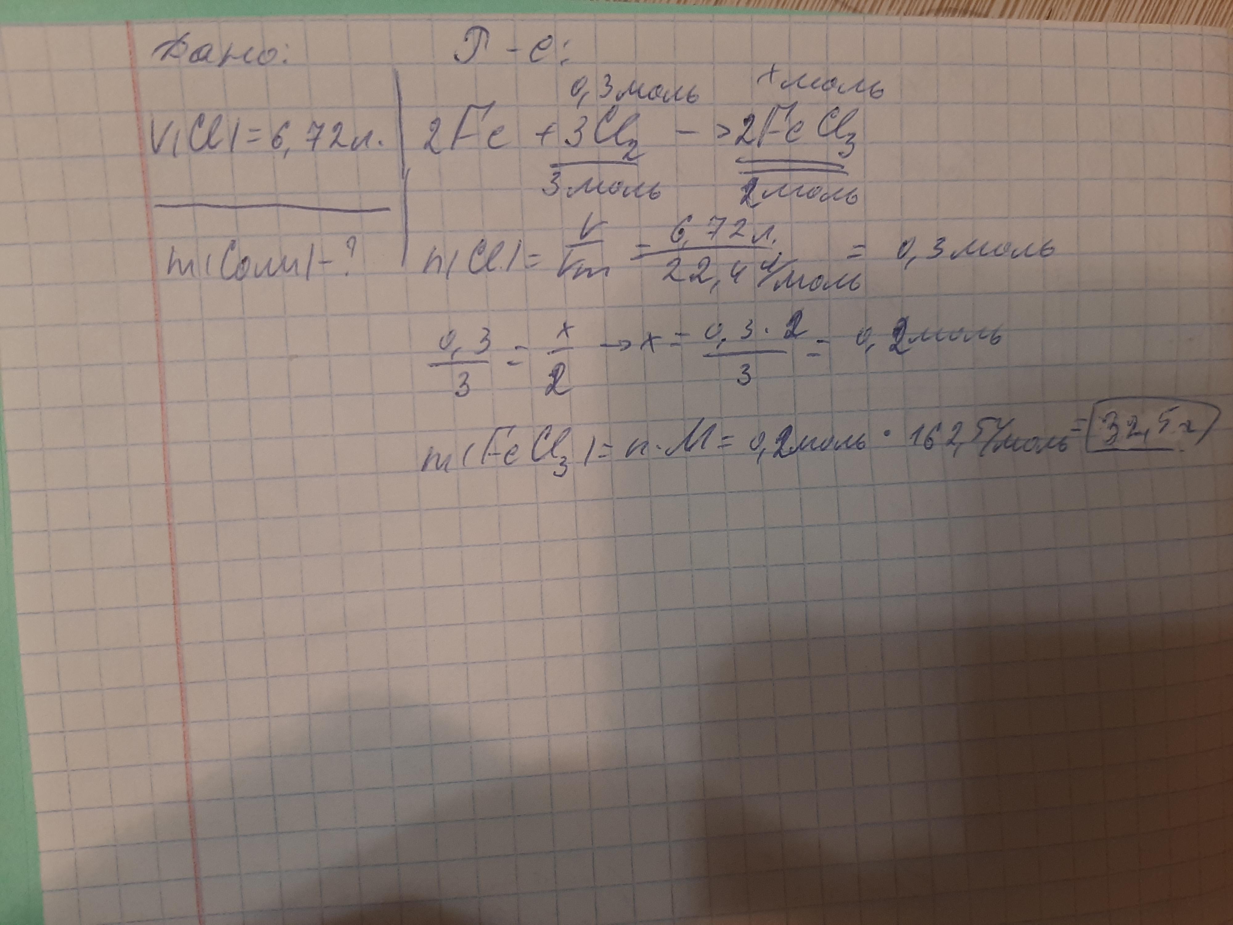 хлор объемом 6,72 л н. у прореагировал железом. Рассчитайте Какая масса соли образовалась при этом ответ 32,5 . Пожалуйста