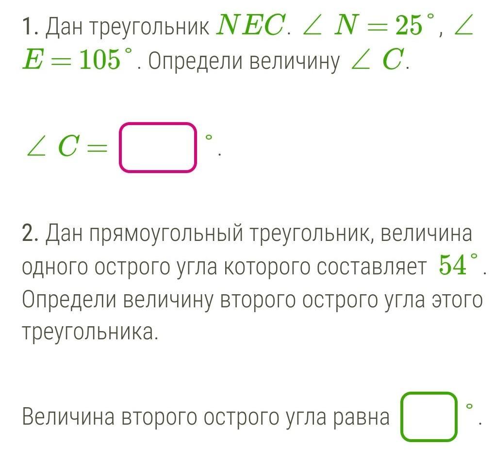 1. Дан треугольник NEC. ∠ N = 25°, ∠ E = 105°. Определи величину ∠ C.