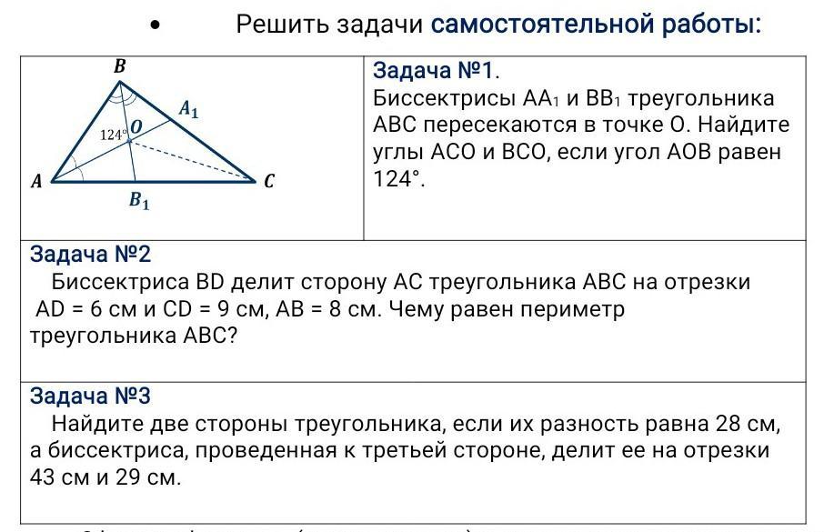 Биссектрисы АА1 и ВВ1 треугольника АВС пересекаются в точке О. Найдите углы АСО и ВСО, если угол АОВ равен 124°.