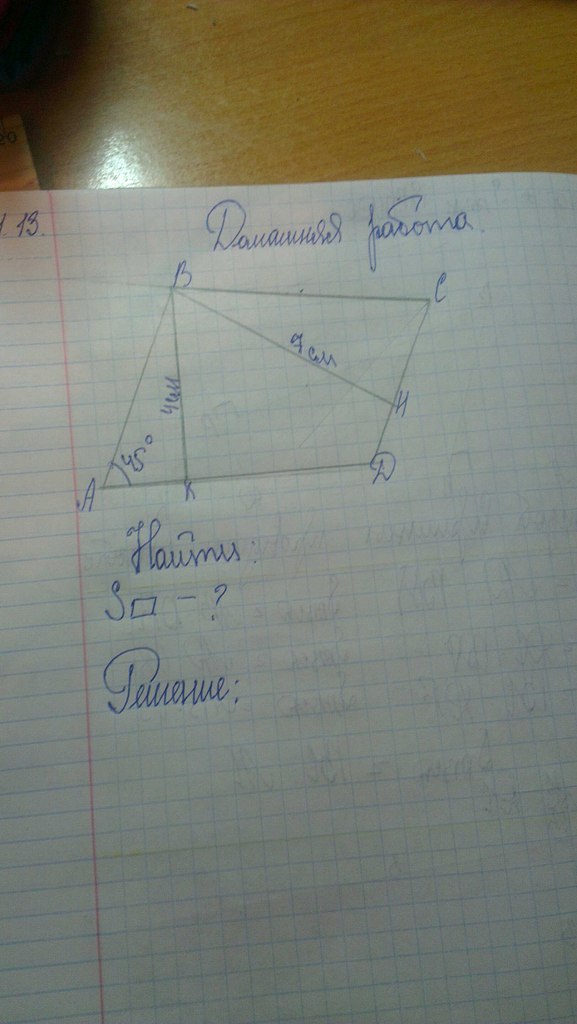 Параллелограмм АВСД, треугольник АВК прямоугольный, равнобедренный уголАВК=90-уголА=90-45=45=уголА, АК=ВК=4, АВ=корень(АК в квадрате+ВК в квадрате)=корень(16+16)=4*корень2=СД, площадь АВСД=СД*ВН=4*корень2*7=28*корень2