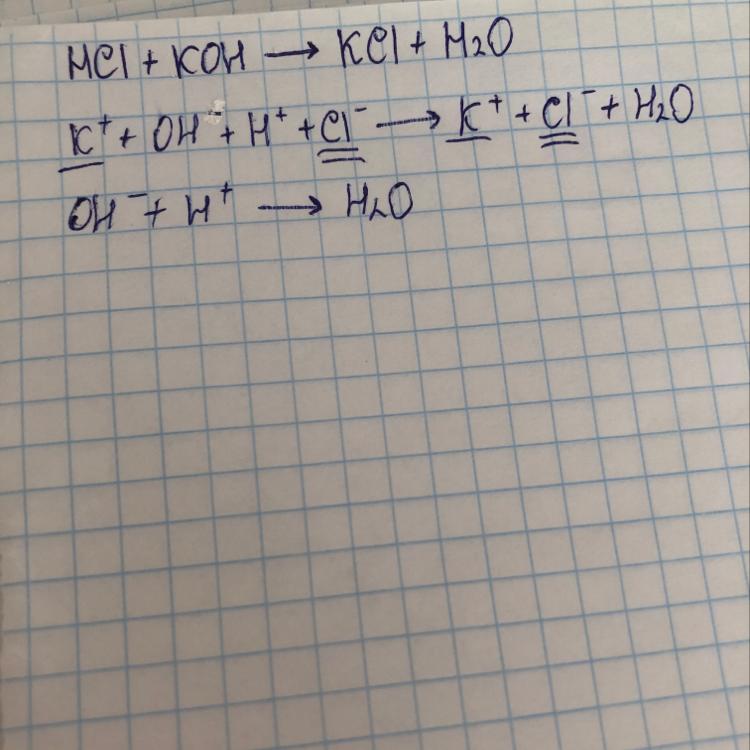 1).Составить молекулярное уравнение между соляной кислотой и гидроксидом калия.Расставить коэффициенты. 2)Электролиты расписать в виде ионов. 3)вычеркнуть одинаковые ионы из левой и правой части. 4)записать то,что осталось(это и есть сокращенное уравнение). СРОЧНО!!!!!!!!!!