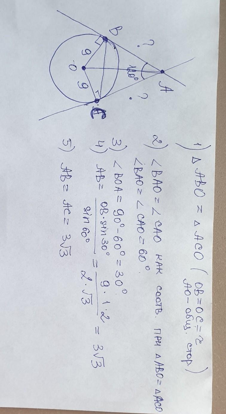 1. Найдите отрезки касательных AB и AC проведенных из точки A к окружности радиуса r=9, угол BAC=120°