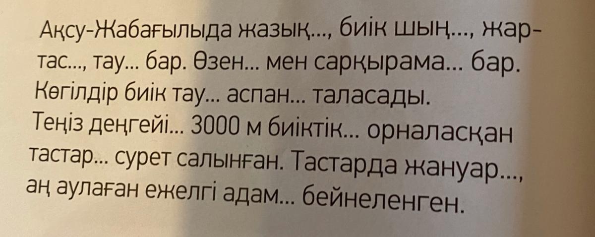 Ответ:жазықтық; шыңдар;жартастар;таулар;өзендер;сарқырамалар;таулар;аспанға;деңгейінен;биіктікте;тастарға;жануарлар;адамдар.