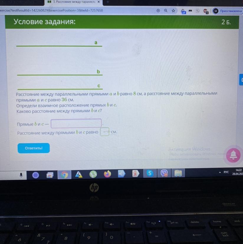 Расстояние между параллельными прямыми а и b равно 8 см, а расстояние между параллельными прямыми а и с равно 36 см.