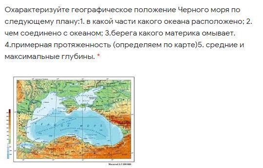 и 27°27'-41°42' в. д. Являясь частью бассейна Атлантического океана, Черное море соединяется с ним на юге через Средиземное море проливами Босфор, Дарданеллы и Гибралтар. На северо-востоке оно соединяется Керченским проливом с Азовским морем.