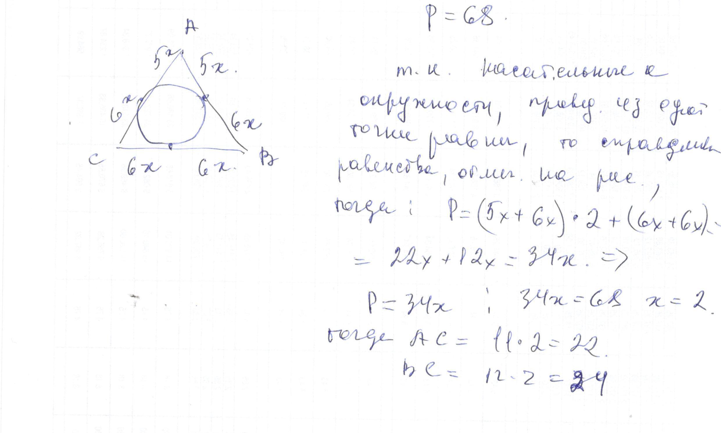 Боковая сторона равнобедренного треугольника делится точкой касания вписанной окружности в отношении 6 : 5, считая от вершины угла при основании треугольника. Найдите боковую сторону треугольника если его периметр равен 68 см (дано, решение, ответ)