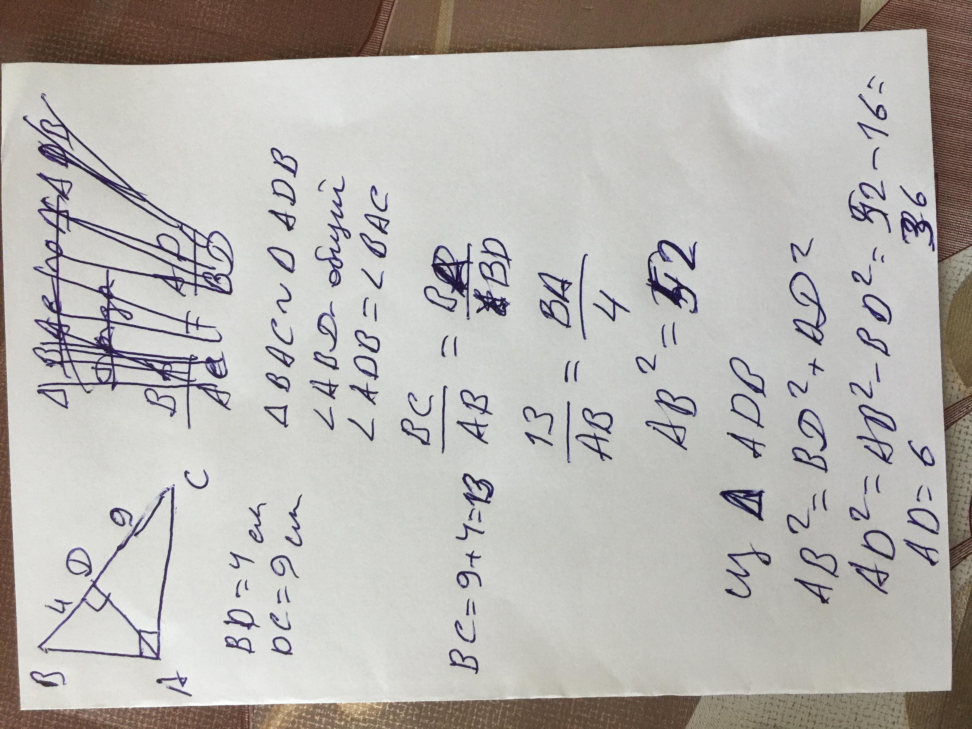 В прямоугольном треугольнике ABC из вершины прямого угла проведена высота AD. Определите длину AD, если BD = 4 см, DC = 9 см.