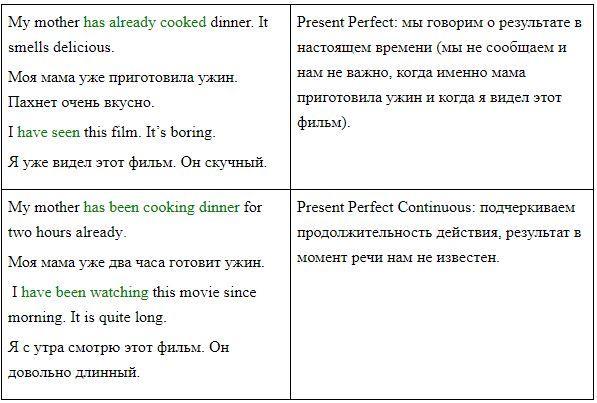 Также, разница между Present Perfect и Present Perfect Continuous заключается в том, что некоторые глаголы не употребляются в форме Continuous (то есть они выражают длительность, но не имеют окончания -ing). К ним относятся глаголы, обозначающие ментальный процесс (know — знать, like — нравиться, understand — понимать, believe — верить) и глаголы, которые выражают чувства и эмоции (hear — слышать, smell — нюхать, taste — чувствовать вкус, hate — ненавидеть, want — хотеть.