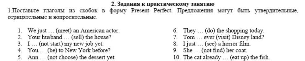 1. We have met just an American actor. 2. Has your husband selt the house? 3. I have not started my new job yet. 4.Have you been to New York before? 5. Ann has not choosed the dessert yet. 6. They have done the shopping today. 7.Has Tom visited ever Disney Land? 8. I have seen just a horror film. 9.She has not found her coat. 10. The car has eaten up already the fish .