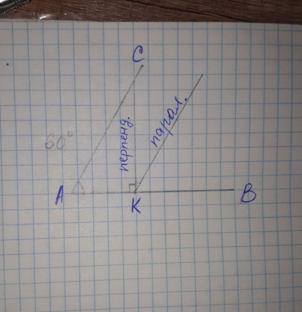 Начертите угол CAB, равный 60 градусов (не на глаз, а при помощи транспортира). На стороне АВ отметьте точку К и проведите через нее две прямые, одна из которых параллельна стороне АС, а другая перпендикулярна стороне АС.