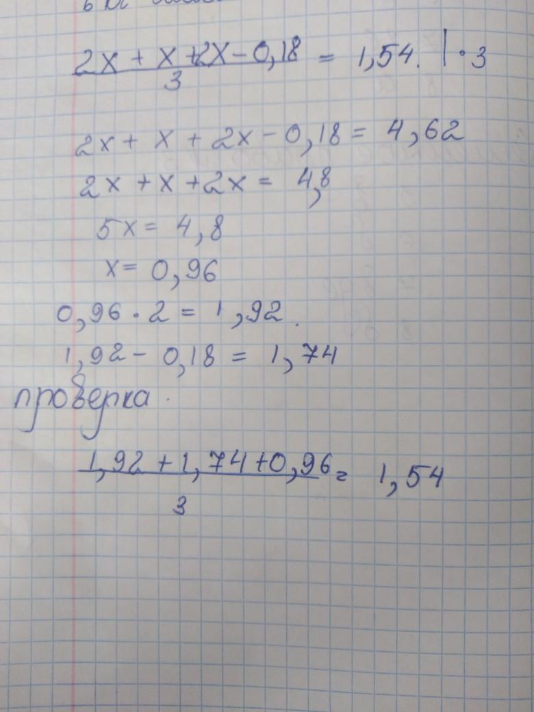 Среднее арифметическое трёх чисел 1,54. Первое число в 2 раза больше второго, а третье на 0,18 меньше второго. Найдите эти числа.