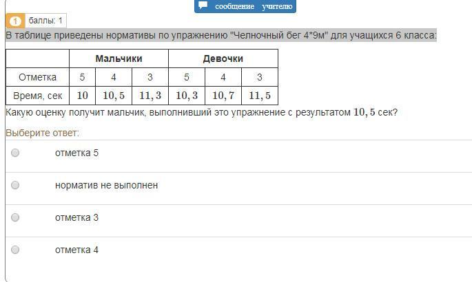 В таблице приведены нормативы по упражнению "Челночный бег 4*9м" для учащихся 6 класса: