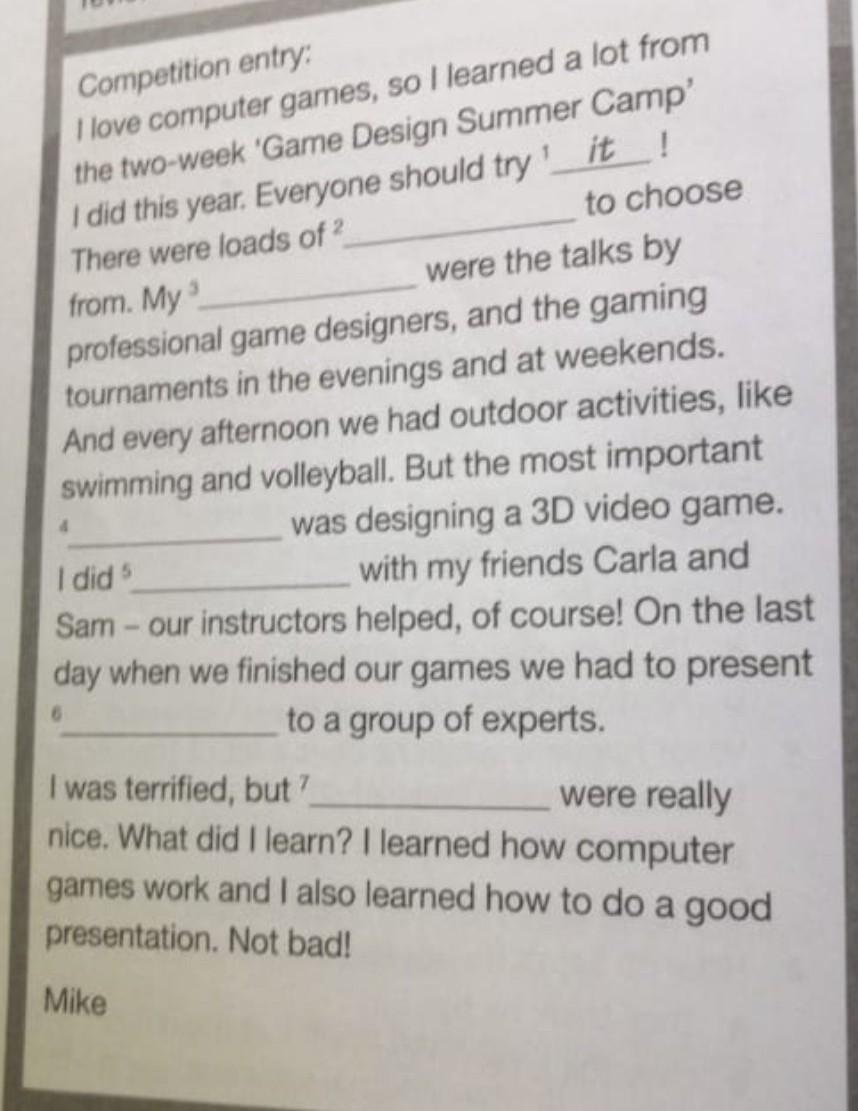 Complete Mike's competition entry with the words in the box. It, this, activities, favourites, one, them, they.