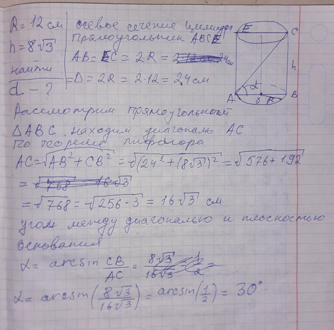 Радиус основания цилиндра 12 см, а высота - 8√3 см. Найти угол, который образует диагональ осевого сечения с плоскостью основания