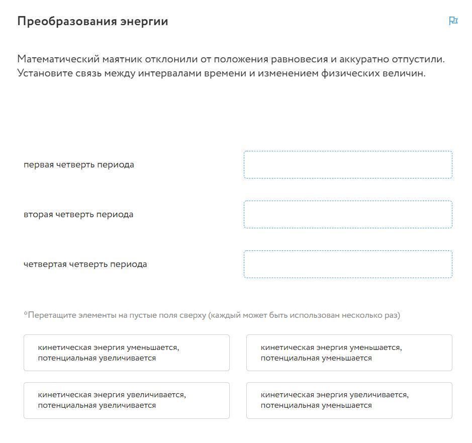 Математический маятник отклонили от положения равновесия и аккуратно отпустили. Установите связь между интервалами времени и изменением физических величин.