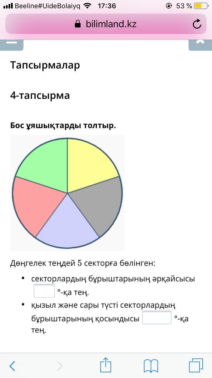 Дөңгелек 5 секторға бөлінген. Секторлардың бұрыштары ның әрқайсысы тең. Помогите плизз