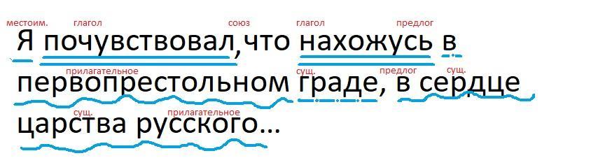 Я(личное местоимение,подлежащее, одной чертой_) почувствовал(глагол,сказуемое, двумя=), что нахожусь(глагол) в первопрестольном(прилагательное,волнистой линией~~~) граде(существительное,пунктиром ------), в сердце(сущ, пунктиром -•-•-•) царства(сущ ---)русского(прилагательное волнистой) …