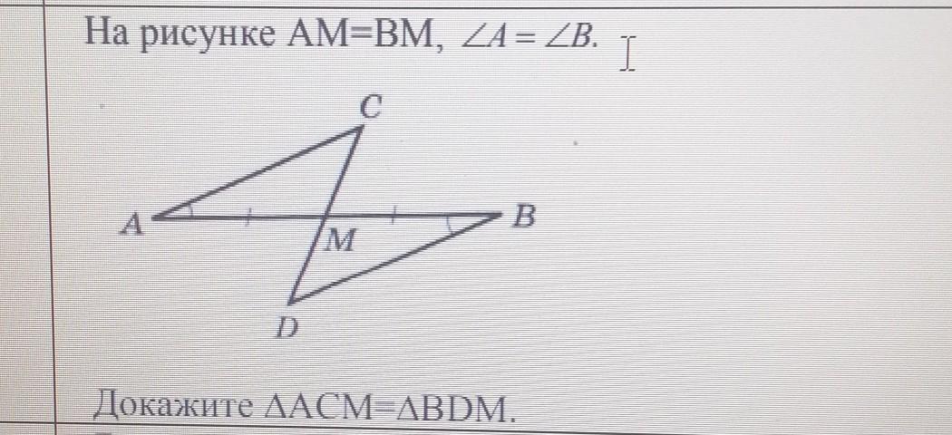 На рисунке AM=BM, угол A = угол B.